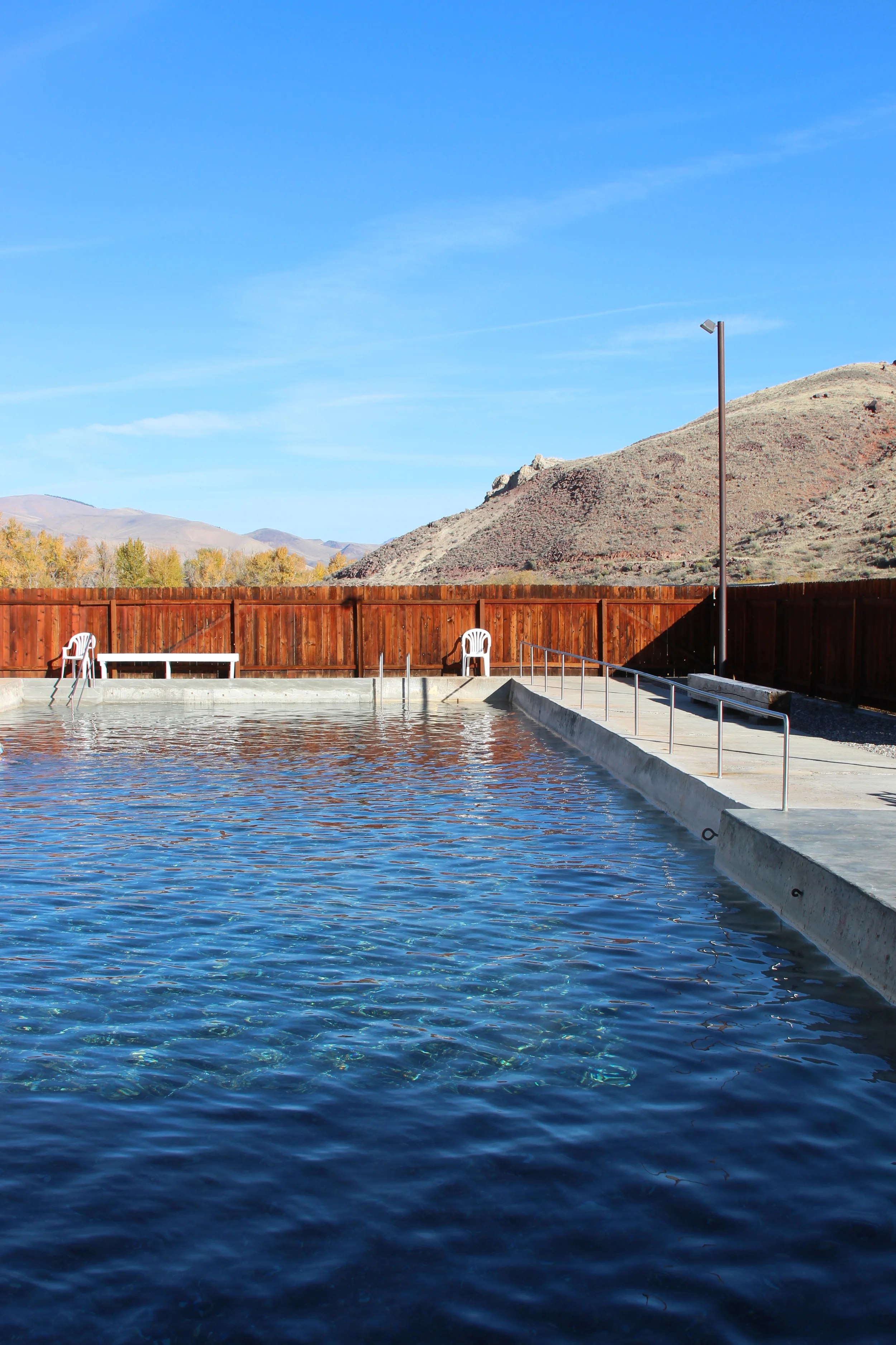 There are two spring fed pools: a hot pool which is a bout 105/106 and the cooler pool which felt about 100 degrees with river rock bottoms so that the heat from the spring can bubble up at your feet. The changing rooms are sparse but clean and utterly charming. The RV spots had water and electricity, horse shoe pits and acres of open space for kids to run free. I am already plotting a return with our fishing gear and a couple other families.