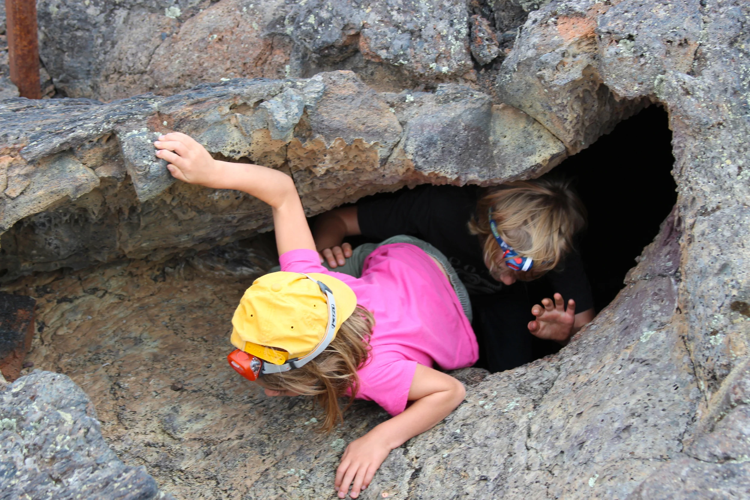 Sometimes I get a little anxious (sometimes a lot) about traveling so I was honestly wondering if I would like this place. Back at the Hot Springs, we told a hunter basking in his recent successful Antelope hunt, where we were going and he said: "Now why would you want to go there? Ain't nothin' there." But I couldn't have disagreed more. Sure, the landscape was stark but it it was mind-blowing for all of us to see the path of the lava, the most recent flow some 2,000 years ago and the oldest over 10,000 yrs ago. The older flows just beginning to revegetate. The newer flows formed lava tubes beneath the surface creating caves. Some of the openings were large and cavernous but others were only large enough to slip your body through the opening but would open up once you got below the surface. Watching my kids scramble into these depths I thought; this is how adventurous spirits are born, so I tried my best to keep the "be careful"s to a minimum … I was going with the flow on the this trip (he he).